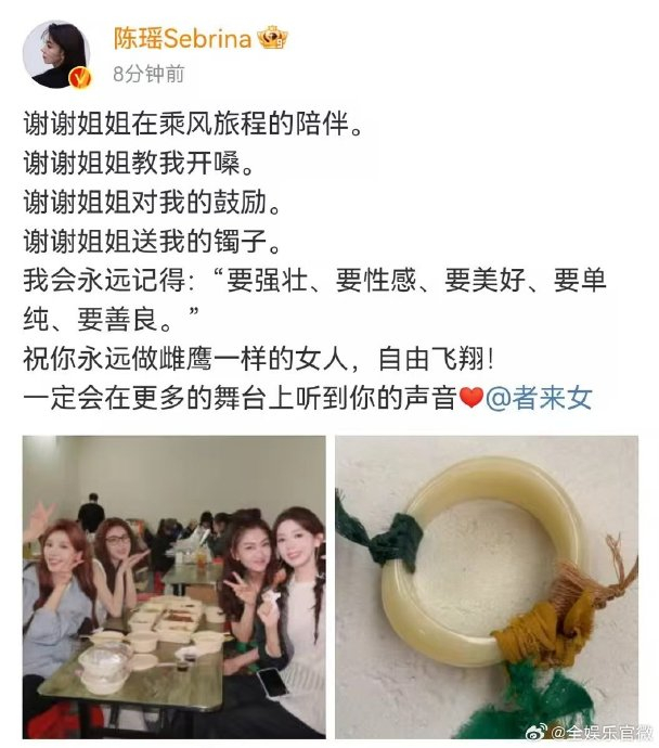 者来女回应:者来女发长文感恩节目组与姐姐们,未直接提及陈瑶,但强调"舞台太小,外面天地广阔",与"雌鹰"祝福形成呼应。