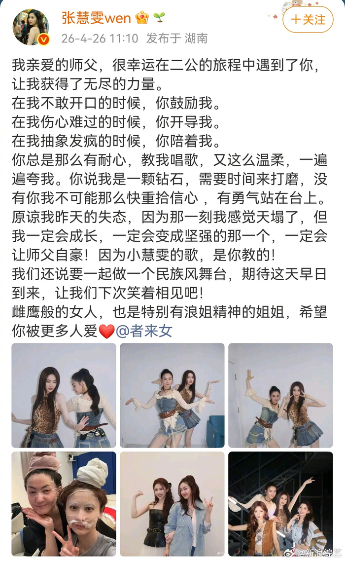 #者来女淘汰时张慧雯感觉天塌了# @张慧雯wen 从不敢开口的忐忑,到二公舞台上勇敢清唱的进步,每一步都离不开@者来女 的耐心打磨与“全肯定式”的温柔鼓励。者来女不仅是她的声乐老师,更是她的精神支柱。面对师父的离开,张慧雯说:“一定会变成坚强的那一个,一定会让师父自豪!” #乘风直播##乘风2026#
