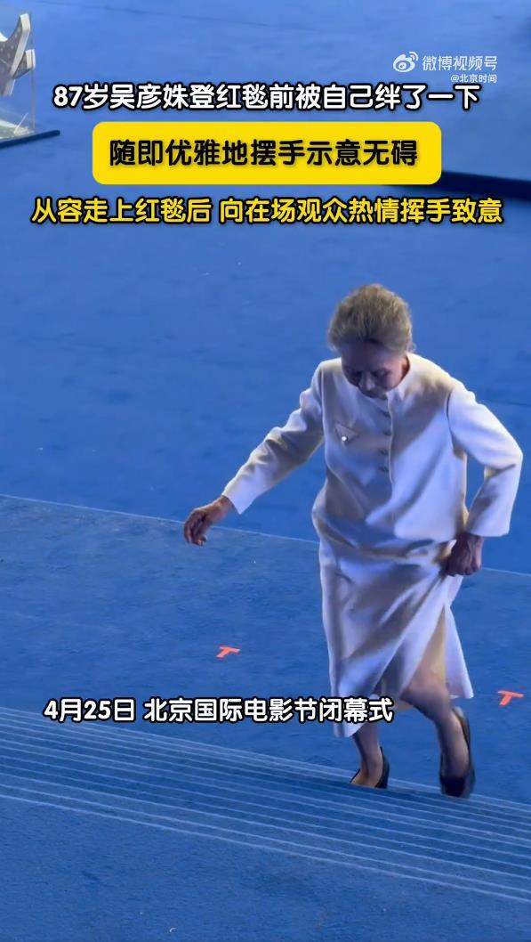 87岁的吴彦姝红毯前不慎被绊了一下,摆手示意无碍,从容走上红毯
