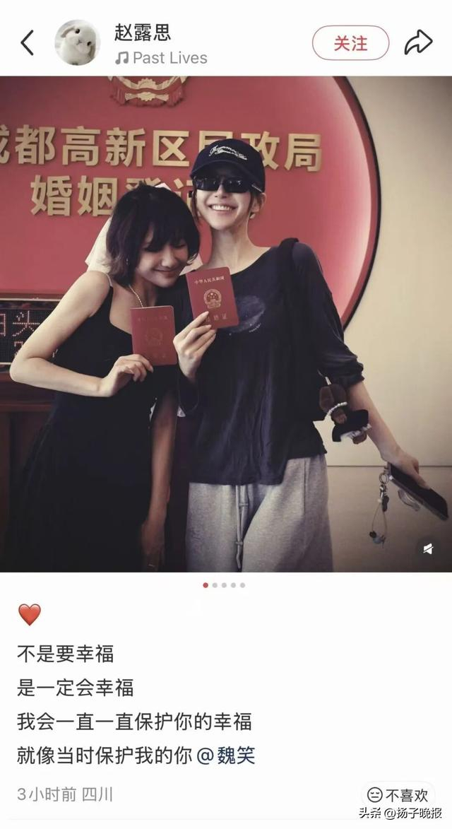 女星魏笑官宣已在成都领证结婚!好友赵露思全程陪同见证,发文:我会一直一直保护你的幸福,就像当时保护我的你