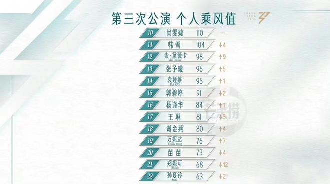 排名前10位的姐姐相对固定,都是那几个人,只不过打乱了顺序。尚雯婕和上次一样是第10名。