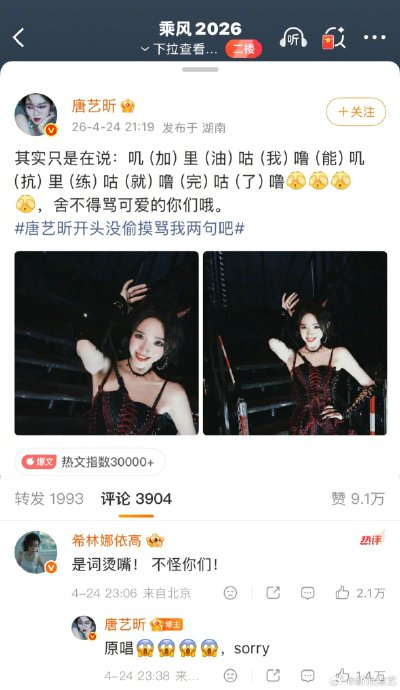 她在微博将模糊发音拆解为励志口号:“叽(加)里(油)咕(我)噜(能)抗(叽)练(里)就(咕)完(噜)了”,调侃“舍不得骂可爱的你们哦”。原唱希林娜依高火速声援:“是词烫嘴!不怪你们!”唐艺昕俏皮回应:“原唱!Sorry!”,被网友称为“祺贵人与熹贵妃梦幻联动”(呼应两人《甄嬛传》角色)。