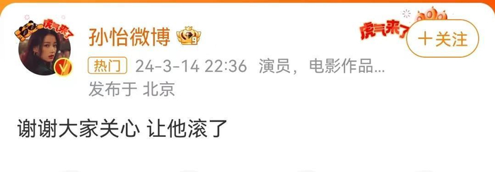 随后,孙怡紧急发声回应与滕光正恋情的热议,表示分手“谢谢大家关心 让他滚了”。