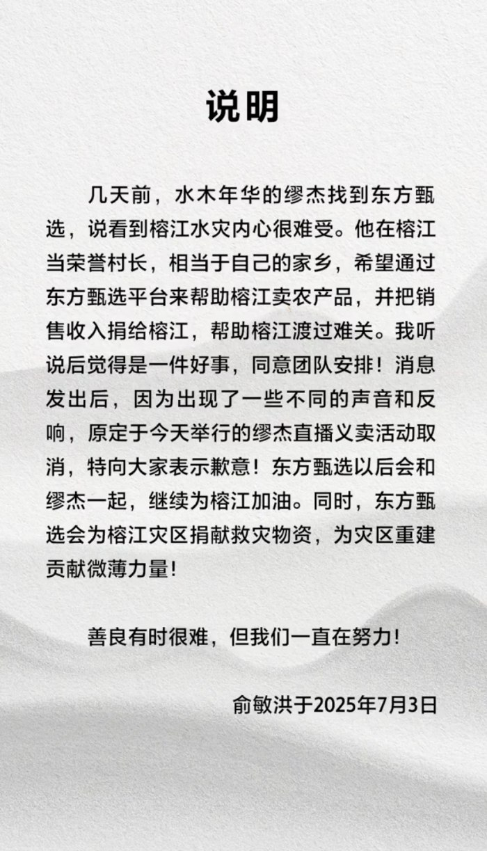 舆论质疑下东方甄选与缪杰义卖直播取消,俞敏洪道歉