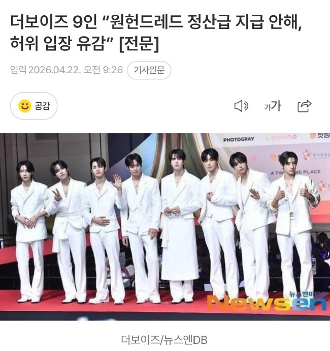 2026年2月,9名成员(上渊、Jacob、泳勋、贤在、柱延、Kevin、Q、善旴、Eric)向经纪公司One Hundred发送解约通知,指控三大核心违约行为: