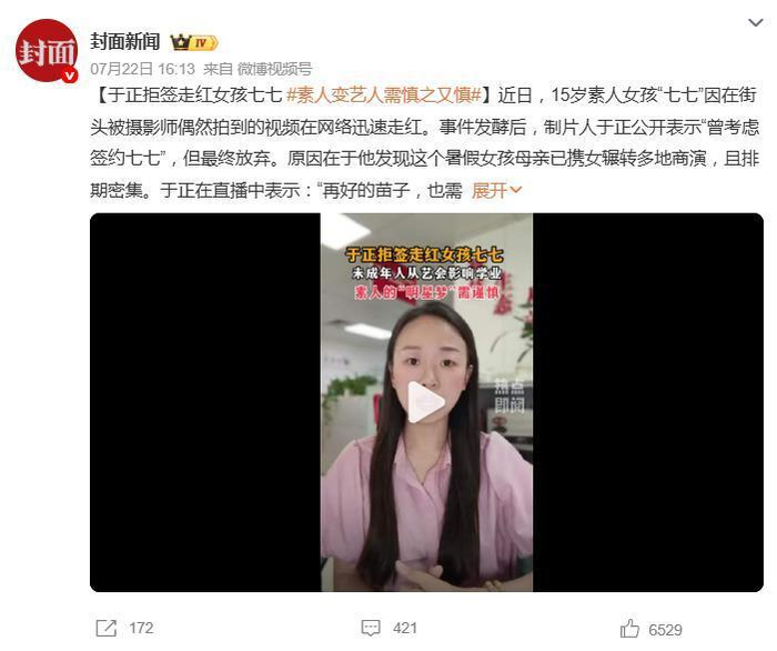 于正拒签走红女孩七七,素人变艺人需慎之又慎