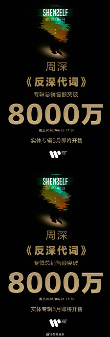 2026年4月26日,周深第二张个人专辑《反深代词》数字版销售额突破8000万元人民币,创限购政策后内地数字专辑销售断层第一纪录,实体专辑将于5月正式发售。