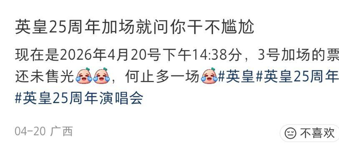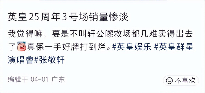 不过英皇自己开演唱会也开得很没诚意,一门心思只忙着兜售门票,其他方面都划水,得罪了一大堆观众。
