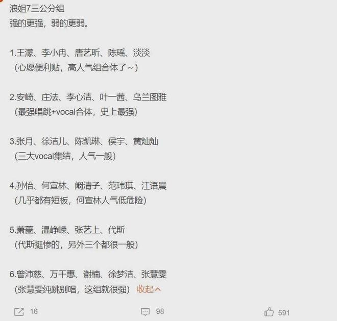 三公分组名单一公布,网上都在讨论「强的特别强,弱的特别弱」,安崎那组直接凑齐了庄法、李心洁、叶一茜还有乌兰图雅,全都是很厉害的说唱歌手,可是问题也就来了,如果抽到唱跳类的曲目,会不会就好像让一群学霸去做手工一样,有能力但不一定合适, 太单一也是个风险。