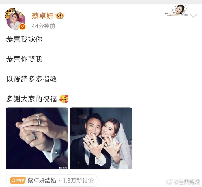 #蔡卓妍结婚# 啊!!!恭喜姐姐!又是一对姐弟恋!她之前说过谈恋爱价值观很重要,看来是遇到对的人了!