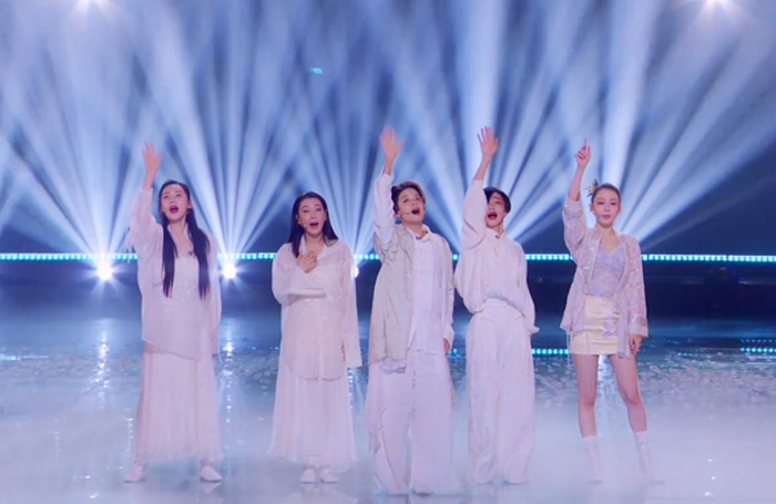 刘逸云、孙悦、谢欣、秋瓷炫、吉娜5位姐姐带来歌曲《苏州河》,一个舒缓、唯美、治愈的舞台,包括舞台设计和服装造型都很有意境美。
