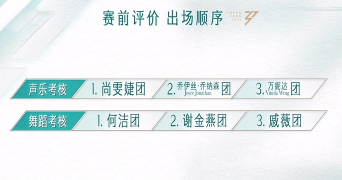 参与声乐考核的有尚雯婕团、乔伊斯团、万妮达团。参与舞蹈考核的团包括何洁团、谢金燕团、戚薇团。