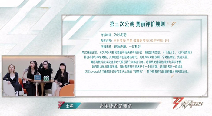 和前两次公演舞台一样,《浪姐5》三公舞台比拼前依旧有赛前小考环节,这一次的考核形式有所不同,分为声乐考核和舞蹈考核,声乐考核需要进行全曲考核,舞蹈考核为30秒齐舞片段。