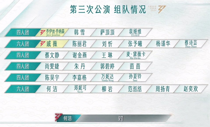 何洁团这一次运气不佳,拿了一首大家都比较嫌弃的原创歌《拥抱一场雨》,小甜歌确实不适合比赛,很多姐姐的特色也被限制了。何洁、郑妮可依旧是焦点,动作干净,表情控制也到位。范湉湉虽然很卖力气,但站在C位破坏了整体和谐度。周扬青继续划水,这位姐姐多留一场,对团队都是一种巨大的伤害。