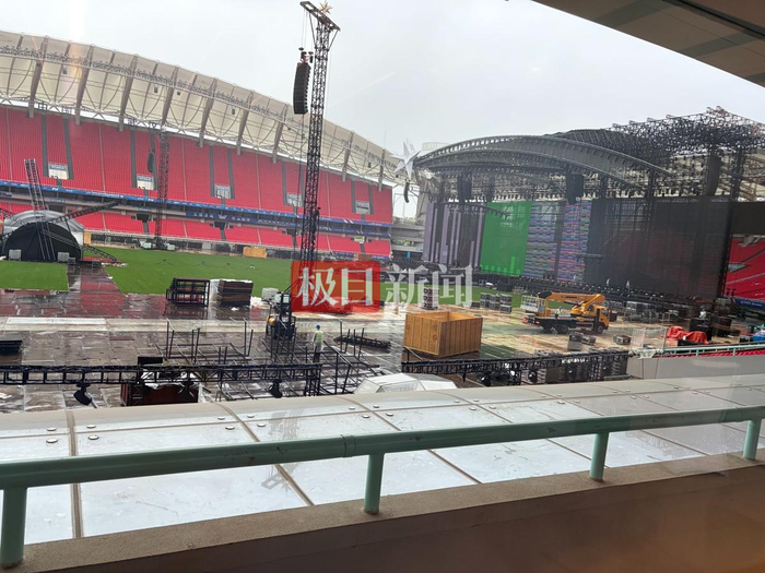 4月28日,极目新闻记者在武汉体育中心看到,这场演唱会正在紧张筹备中,工作人员正在冒雨搭建舞台,吊车开进场内进行设备安装,多个演出设备正在有序安装中。