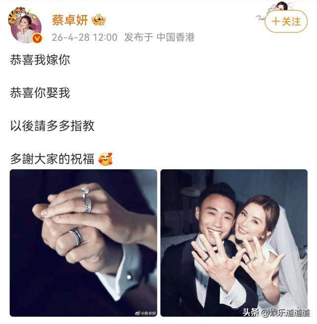 家人们!道哥蹲到娱乐圈今日最大喜报,直接炸翻热搜——蔡卓妍(阿Sa)官宣结婚啦!没有预热、没有路透,4月28日中午直接甩上婚纱照,配文“恭喜我嫁你,恭喜你娶我”,主打一个干脆利落,把吃瓜群众打了个措手不及
