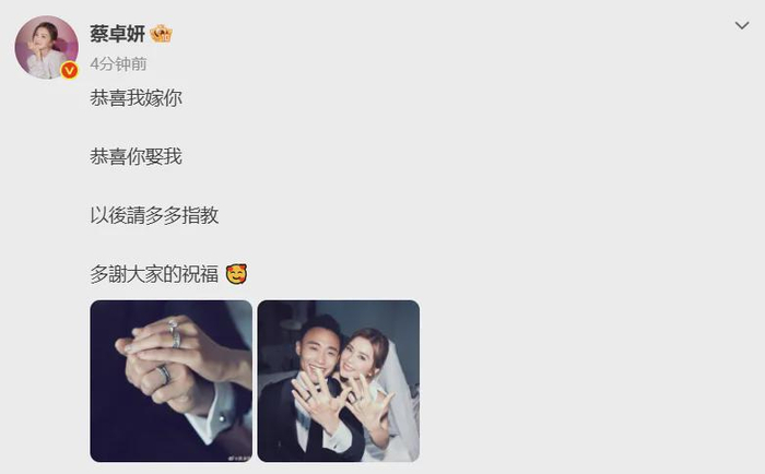 刚刚,蔡卓妍发文官宣结婚: