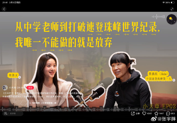 章泽天对话登山家艾拉·郑的播客口碑为何能实现逆袭?