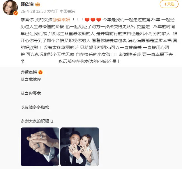 搜狐娱乐讯 4月28日,蔡卓妍在社交平台发文官宣结婚:“恭喜我嫁你,恭喜你娶我,以后请多多指教,多多谢大家的祝福。” 随后,圈内好友们纷纷送上祝福。