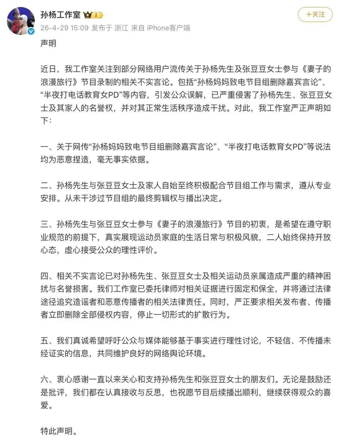 目前孙杨工作室发布声明否认了网传爆料,强调孙杨一家人从始至终积极配合节目组工作与需求,从未干涉过节目组剪辑和播出决定。