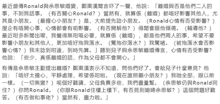 记者提到郑中基与余思敏的婚变传闻,郑东汉没有承认或者否认,仅表示,“离婚与否是他们二人的事,不到我话事。”