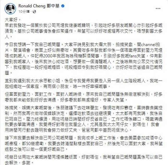 郑中基突然发文,表示合作10年的经纪人何庆湘“工作及道德操守有问题”,二人即时解约。
