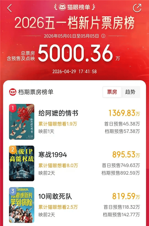 2026年4月29日,年度票房(含预售)突破129亿元;五一档新片预售破5000万元,形成“温情黑马+港片王牌+喜剧阵容”三强格局。