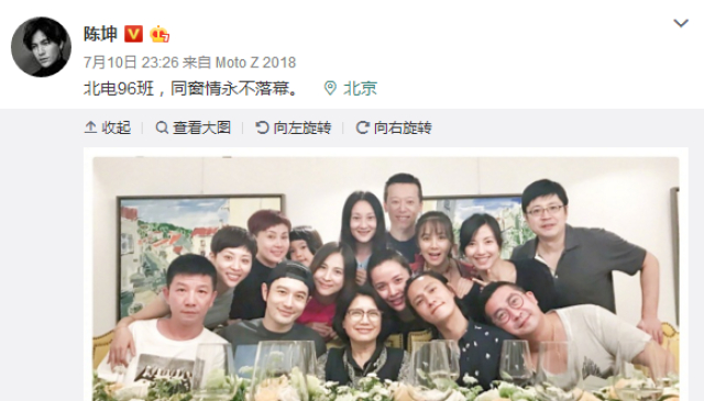 同窗情谊深!陈坤晒北电96班聚会照 黄晓明也来了