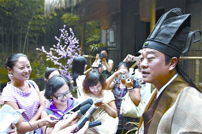 本报读者体验新版《还珠格格》中的道具——大鼓