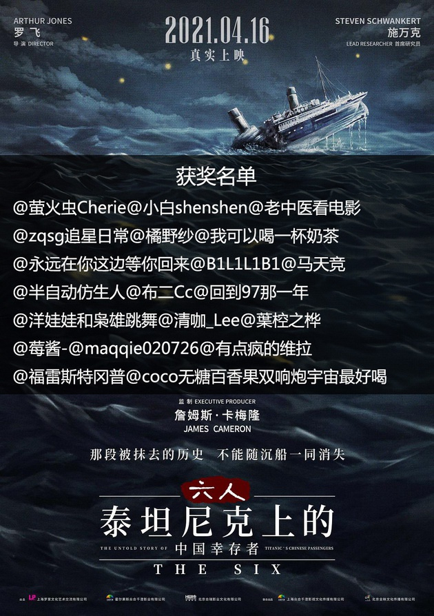 所有中奖团员请于4月17日 23:59前使用[用手机客户端或电脑客户端的微博电影点评功能]点击进入微博电影《六人-泰坦尼克上的中国幸存者》点评页提交不少于140字的原创观后感,欢迎大家使用写长评功能发布长影评。