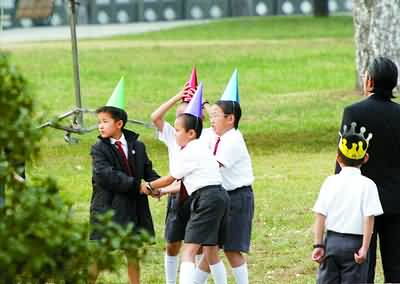 跟医院里压抑的气氛相比,昨天的戏轻松愉快多了。江边的草坪上,一帮穿着校服的孩子围着一大桌好吃的,“小学一年级本月寿星生日”几个大字高高挂起。寿星不是别人,正是周星驰的儿子“小星星”,也就是小堤。让人诧异的是,之前“因公殉职”的周星驰这回又站到了草坪上,参加儿子的生日聚会。原来在外星人的帮助下,已经进了停尸房的周星驰“死而复活”了。跟《功夫》的结局一样,主角在经历一番苦难之后终于得到了新生。不过,外星人似乎并没有帮助周星驰“脱贫”,身上穿的还是穷困潦倒的旧西装。衣服破旧,脸上的表情可是相当喜庆。原本计划3个月完成的外景戏提前完成了,能不开心嘛。