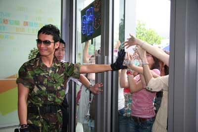 信报香港专电(特派记者宗珊) 香港九龙塘教育服务中心里,几名迷彩服枪手端枪瞄准,一动不动。仔细看时,几名枪手竟是陈冠希(听歌)、黄晓明(听歌)、任贤齐(听歌,blog)和香港无线男演员林保怡。昨天下午,《神枪手》在香港举行探班活动,几名帅哥摆出射击姿势比酷。