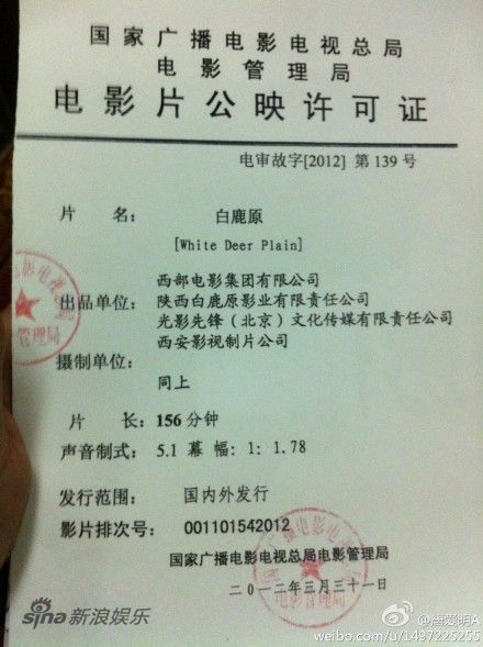 昨日下午,制片人王乐告诉记者,《白鹿原》已取得电影片公映许可证。为避免争议,他领到许可证后在国家电影总局门外拍了张照片。随后,在他发给记者的电子邮件中,记者清楚看到王乐站在电影总局门口,双手展示一张编号为电审故字[2012]第139号的电影片公映许可证。在这张由国家广播电影电视总局、电影管理局2012年3月31审发的公映许可证上,中文片名为《白鹿原》、英文片名《White DeerPlain》 ,正式公映的电影片长156分钟,国内外同时发行。声音制式:5.1幕幅:1:1.78。王乐告诉记者,他昨日刚从北京返回西安,正在商量公映档期。留出电影宣传时间,今年观众一定可以在影院看到该片。