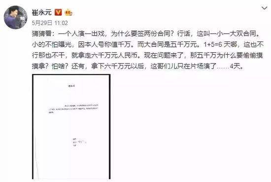 5月28日,崔永元通过微博发布了几张演艺合同照片并配文:“你不用表演,你是真烂。”合同中因有范冰冰名字,其中曝光合同约定片酬为税后1000万元。