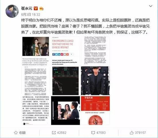 崔永元又发微博表示,终于明白为啥你们不还嘴,原以为是反思喝闷酒。实际上是怕股票跌,还真是把股票当爹。把股民当啥?韭菜?傻子?我不懂股票,上条把华谊集团当成华谊兄弟了,在此郑重向华谊集团致歉!但如果有坏消息就会跌,我保证,这错不了。