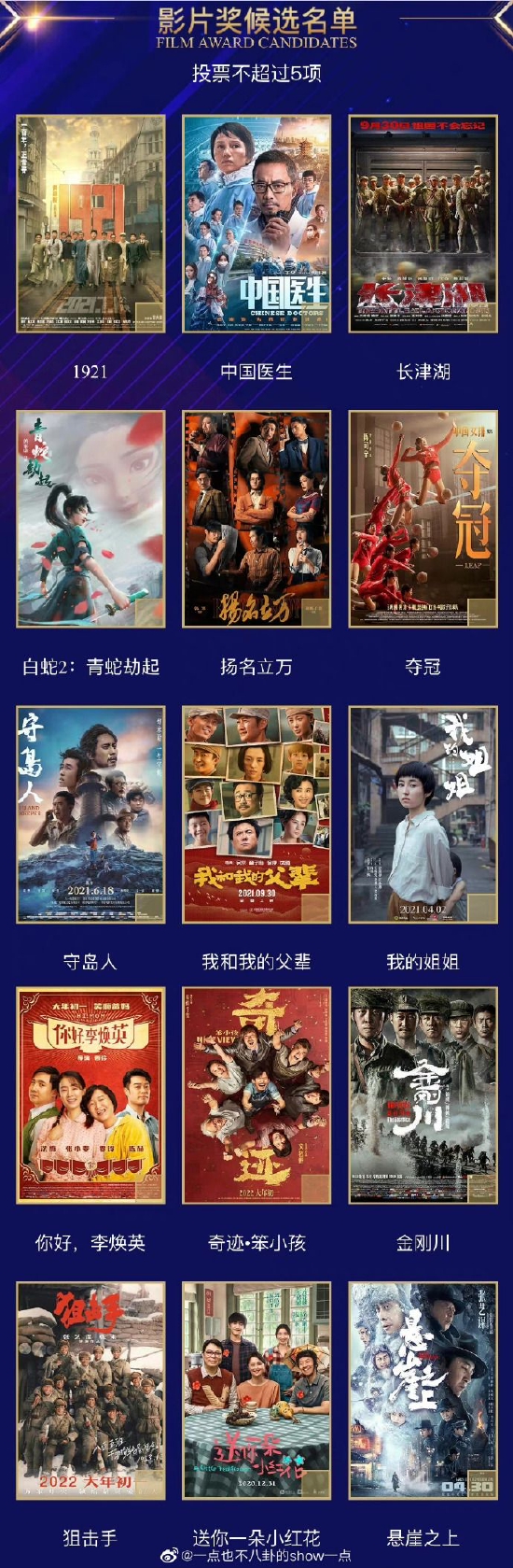 8张新浪娱乐讯 6月10日,第36届大众电影百花奖启动投票。参评影片范围限于取得国家电影局颁发的《电影片公映许可证》、观影人次达100万以上、在当届评奖周期(2020年2月1日至2022年2月28日两年度)内全国城市影院发行放映的国产影片。从即日起至2022年7月10日为观众投票阶段。观众投票阶段结束后,将由组委会指定的选票统计中心统计观众投票结果,评选出第36届大众电影百花奖各奖项的提名者。