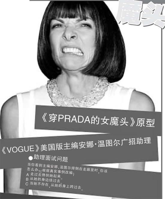 她够嚣张,人未进公司,咖啡、午餐已经准备好,下属则忙得团团转;命令永远只说一次,助理要24小时开机候命;台风天气,机场所有航班停飞,她要求助理订飞机去纽约……3年前,一部风靡一时的电影《时尚女魔头》让所有人都记住了那个号称是从地狱里来的米兰达。现在,即便是那些读惯《经济学人》、从不买《VOGUE》的人至少也说得出,这是个在时尚圈里呼风唤雨、点石成金,却对属下极其苛刻的狠角色。