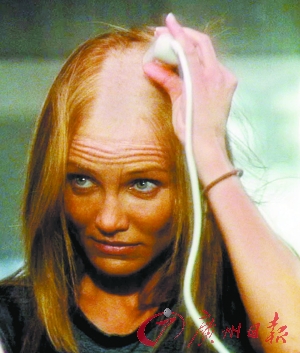 本报讯 由卡梅隆·迪亚兹主演的新片《姐姐的守护者》(英文片名:My Sister's Keeper),首批剧照及预告片段已于日前正式曝光。电影改编自同名小说,影片讲述因为大女儿凯特不幸患上血癌,母亲卡梅隆为了支持她对抗癌症决定剃光头。日前曝光的一张剧照便是卡梅隆独自一人拿起剃发器,立心将自己长长秀发全部剃光,在剧照中她神情带点恐怖,不知道的人还以为她在拍摄恐怖片。但其实卡梅隆只是戴头套上阵,无须真正削发拍摄。