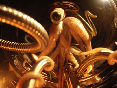 50年代的科幻恐怖片相当了得,而Metaluna星人更是独树一帜,他们长得跟人类没有一丝相象之处:有一个大的惊人的脑袋,甚至能看见大脑清晰的沟回纹路,更要命的是他们还露着内脏,连手脚也退化成爪状了得还睁着一双夸张的金鱼眼。
