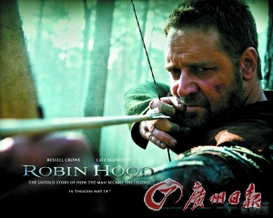 雷德利·斯科特导演、罗素·克洛、凯特·布兰切特主演的《罗宾汉》前日在广州举行试片。这部新的《罗宾汉》说的并不是罗宾汉的绿林英雄生涯,而是用了绝大部分剧情来描述罗宾汉成名之前的宏大社会历史背景和恋情,据观众反映更像是《罗宾汉前传》。该片将于明日在中国内地上映。