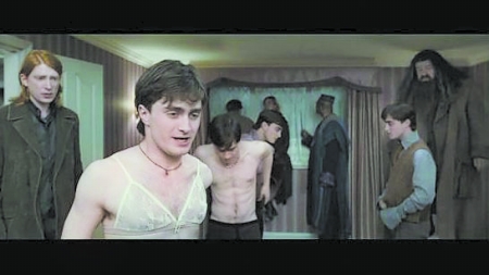 该片不仅有吻戏,还有裸戏,一个魂器为了保护伏地魔,让罗恩产生了幻觉,看见赫敏和哈利拥抱在一起亲吻,此时的哈利和赫敏全裸出现,相互拥抱、激吻,看得观众目瞪口呆,实属少儿不宜。