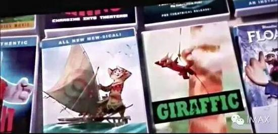 《巨人国历险记》英文片名是Gigantic,片中的山寨DVD给改成了Giraffic,片名Logo字体一样,还再次恶搞了一把长颈鹿的身高梗。《莫阿娜》也是,船帆LOGO一样,只是主角变成了猫。