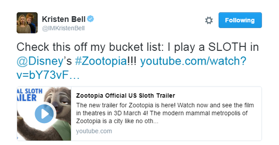 贝尔也在推特上表达了自己演了只树懒的激动心情(!!!)