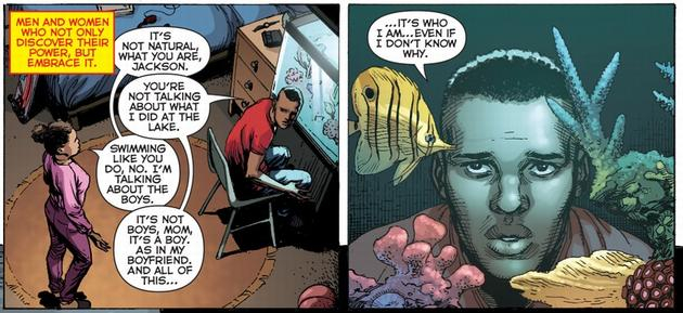 Q:同样一个新52消失了之后回归的角色是二代海少侠Jackson Hyde/Kaldur'ahm,但他这次不仅回来了还变成了gay,一个喜欢男性的、挣扎的少年。你们做这个改变的时候是怎么考虑的?