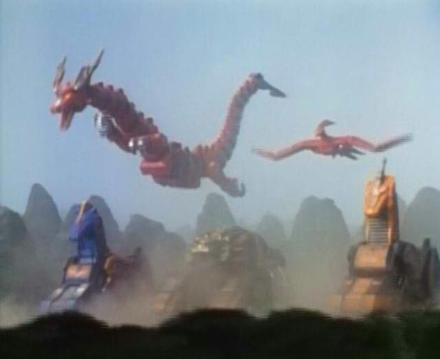 这是因为萨班把日版接在恐龙战队后的新作品:1995年开播的《五星战队大连者》的巨大机器人战斗画面,挪来当作新的剪片来源了,而《五星战队》正是以中国风为主打。从此以后,战队的成员召唤佐德,通通会出现恐龙们被雷击打中“变”成中国神话生物的兼用画面,以解释何以“恐龙”战队不用恐龙了。