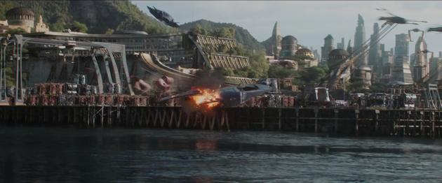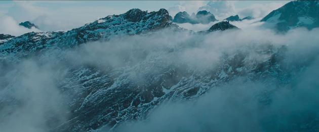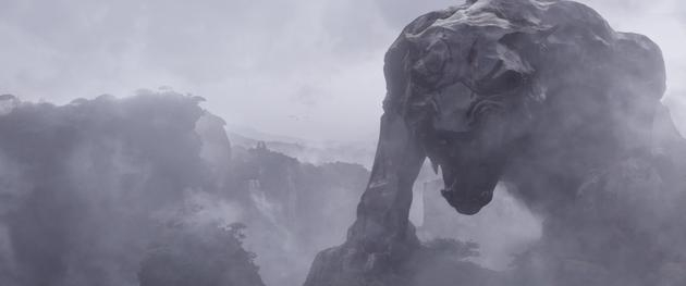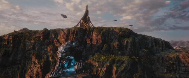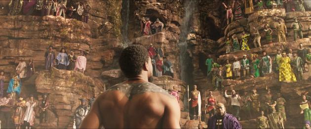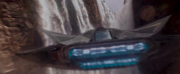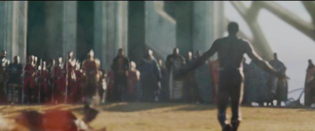 神在天上飞(雷神)——对应黑豹超先进的坐骑,皇家Talon飞行器,从古老的勇士瀑布上空飞过。这里疑似是T‘Challa飞去参加新国王登基大典,接下来会出现第一个预告中的情节:他走下飞行器,迎向瀑布四周山崖上满满的瓦坎达人民,迎向他崭新而沉重的职责。