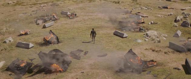 Killmonger发出“烧毁一切”宣言后,画面真来到了一个战火弥漫之处,从设备设施看,背景应该是振金矿。而地上散落着盒子形状的东西,会不会装的是振金或相关的东西?