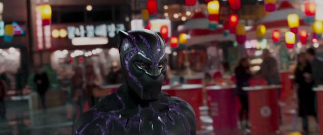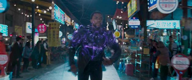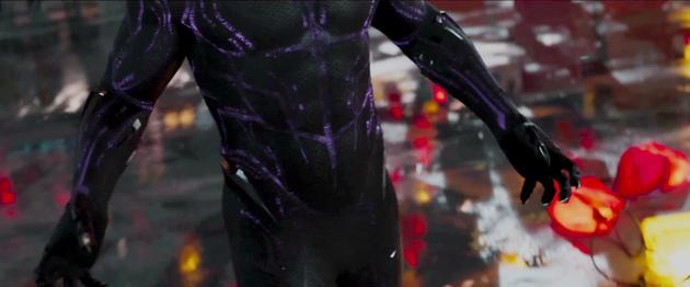 继续韩国追逐场景,而《美队3》里还要手动脱下头盔的黑豹,这次闪着紫色光芒的制服,是贴着皮肤自己“长”出来!