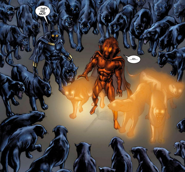 这里到底是什么情况?可以猜一猜,漫画中有T‘Challa看到了他的祖先、曾经的黑豹们的灵魂(都是豹型)的情节。甚至黑豹演员博斯曼在去年曾说过:那是他补漫画时最喜欢的一个画面。T’Challa曾经被豹神Bast赋予能力成为“死人之王”,能与死去的灵魂交流(不过个人觉得那一段对这个能力的处理挺囧的。。)。而最近的《黑豹》个人刊,Shuri开始大部分时间是“死”的,她的灵魂、记忆处在一个叫Djalia的特殊空间位面里。