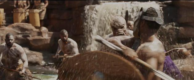 然而这个预告之后和上一个预告,又都出现了Killmonger从背后变出两把武器,跟Dora Milaje对打的画面。这个预告剪得好像是上一个镜头——人群前的Killmonger的手动了一下,接下来就是拿出武器开打,但其实这两个镜头是分开的。他拿武器那里,已经跟Dora Milaje是敌对中了。